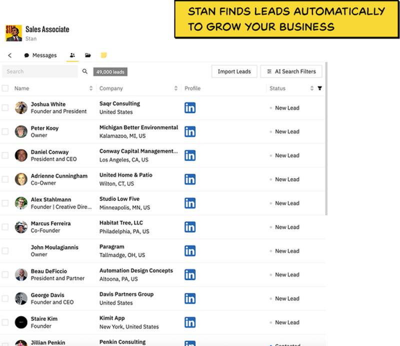 Stan qualifies leads around the clock, books appointments, and even handles initial client conversations. He can manage thousands of leads simultaneously and ensures every potential client gets immediate attention, boosting conversion rates significantly.